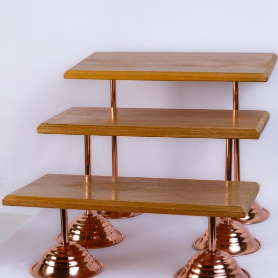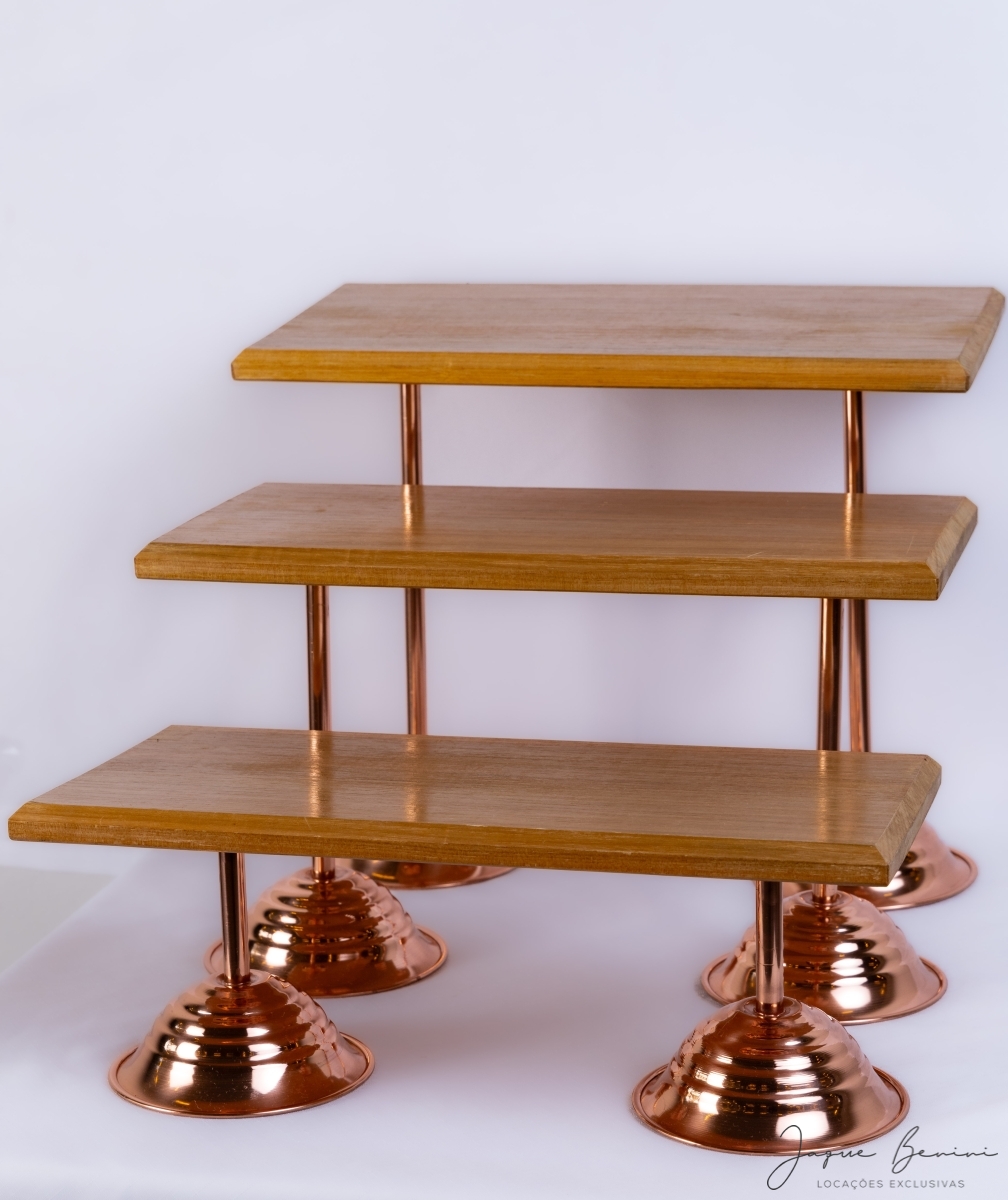Alugue Trio de Suporte de Madeira com Pés de Cobre para o seu evento. Além desse, você pode encontrar diversos outros itens excluvivos para decorar sua festa na Jaque Benini Locações Exclusivas.
